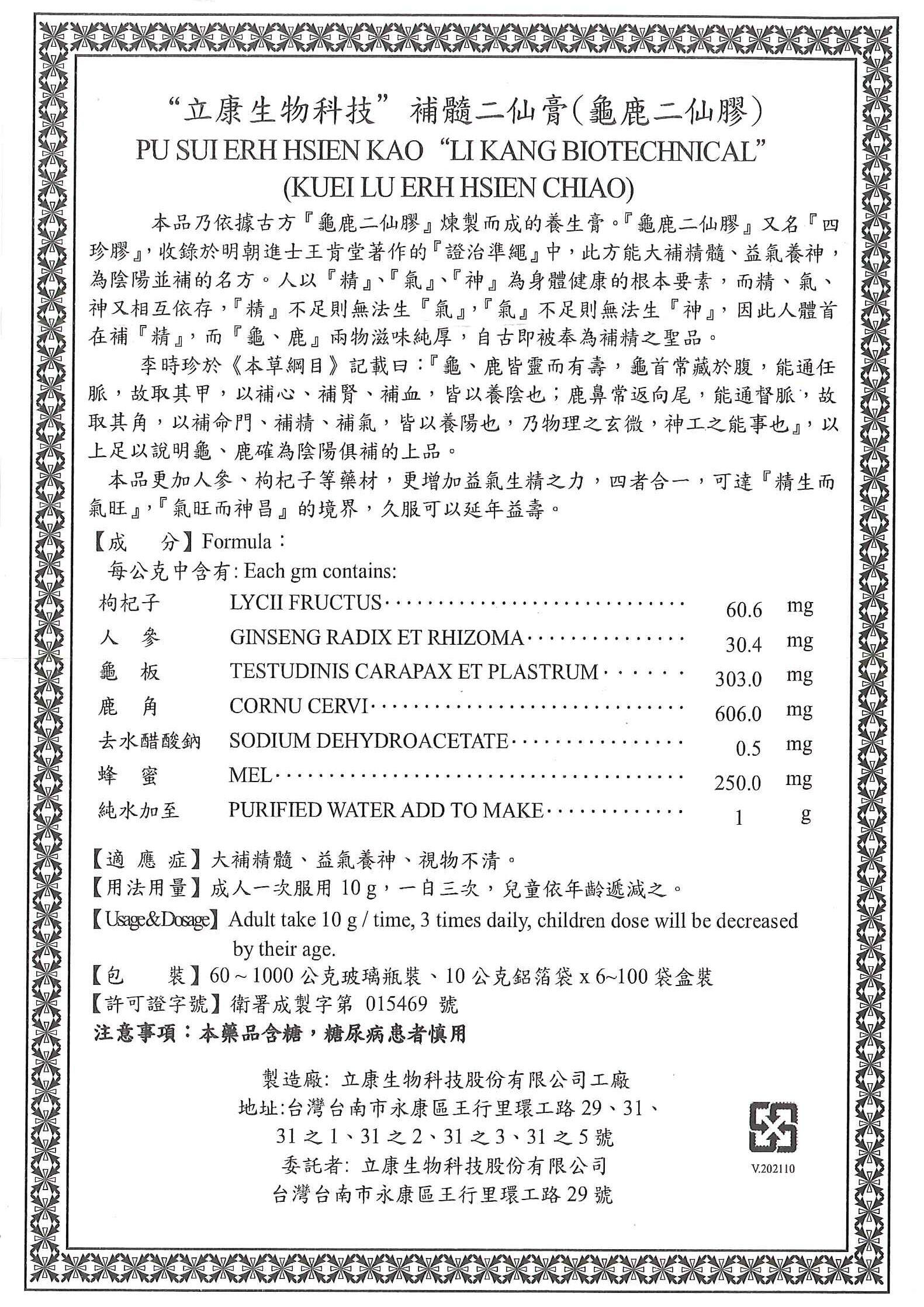 PU SUI ERH HSIEN KAO“LI KANG BIOTECHNICAL”(KUEI LU ERH HSIEN CHIAO)